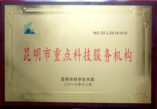 公司2018年12月被昆明市科學技術局認定為【昆明市重點科技服務機構】